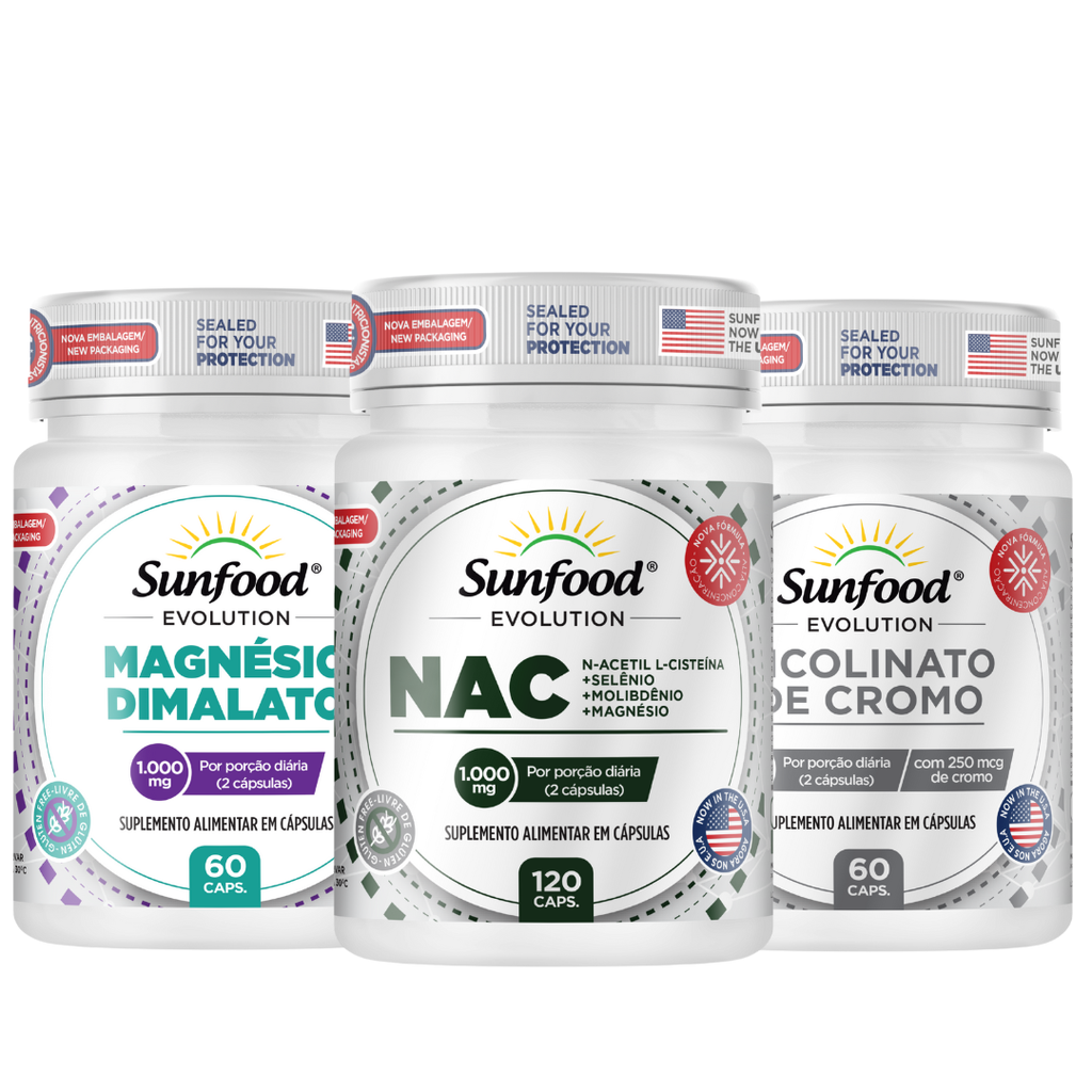 O Magnésio Dimalato melhora disposição e função muscular, o NAC apoia o fígado e é um poderoso antioxidante, e o Cromo Picolinato regula o açúcar no sangue e reduz a vontade por doces. Juntos, promovem mais energia, equilíbrio metabólico e proteção celular.