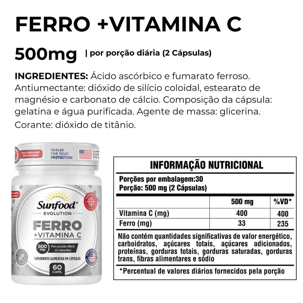 Quando se trata de suplementos para a saúde, a qualidade é fundamental, e o Ferro Sunfood 500mg 60Caps não decepciona. Fabricado pela Sunfood, uma marca reconhecida por sua excelência e compromisso com a saúde, este produto é formulado com ingredientes premium, sem adição de substâncias artificiais ou conservantes.