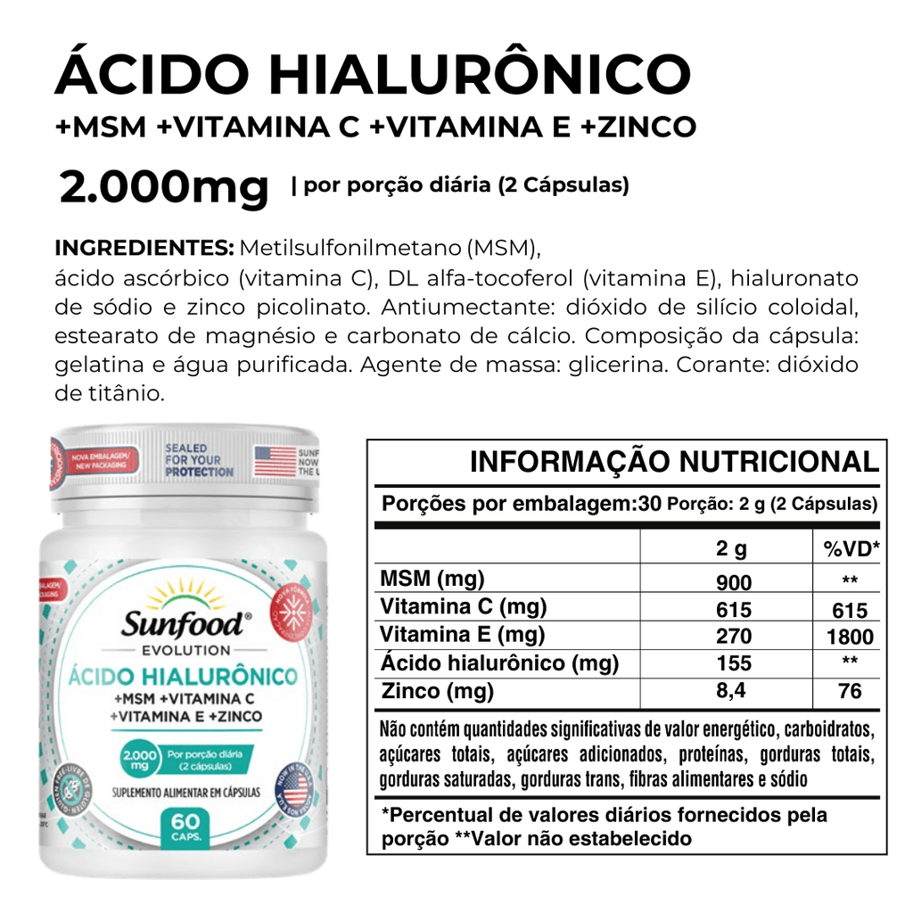 Quando se trata de suplementos, a qualidade é fundamental, e o Ácido Hialurônico Sunfood 2000mg 60Caps não decepciona. Fabricado pela Sunfood, uma marca reconhecida por sua excelência e compromisso com a saúde, este produto é formulado com ingredientes premium, sem adição de substâncias artificiais ou conservantes.