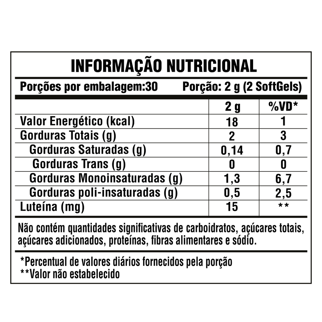 ** Valores diários de referência com base em uma dieta de 2.000Kcal ou 8.400KJ. Seus valores diários podem ser maiores ou menores de acordo com suas necessidades energéticas.